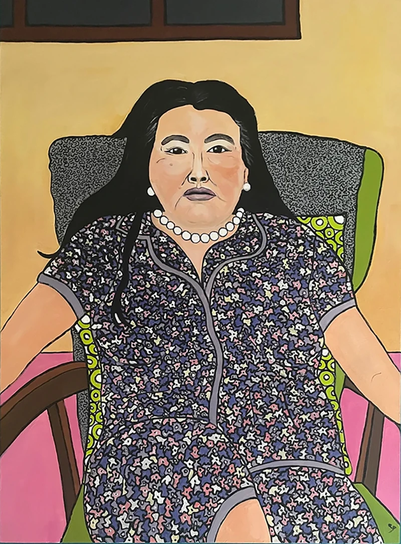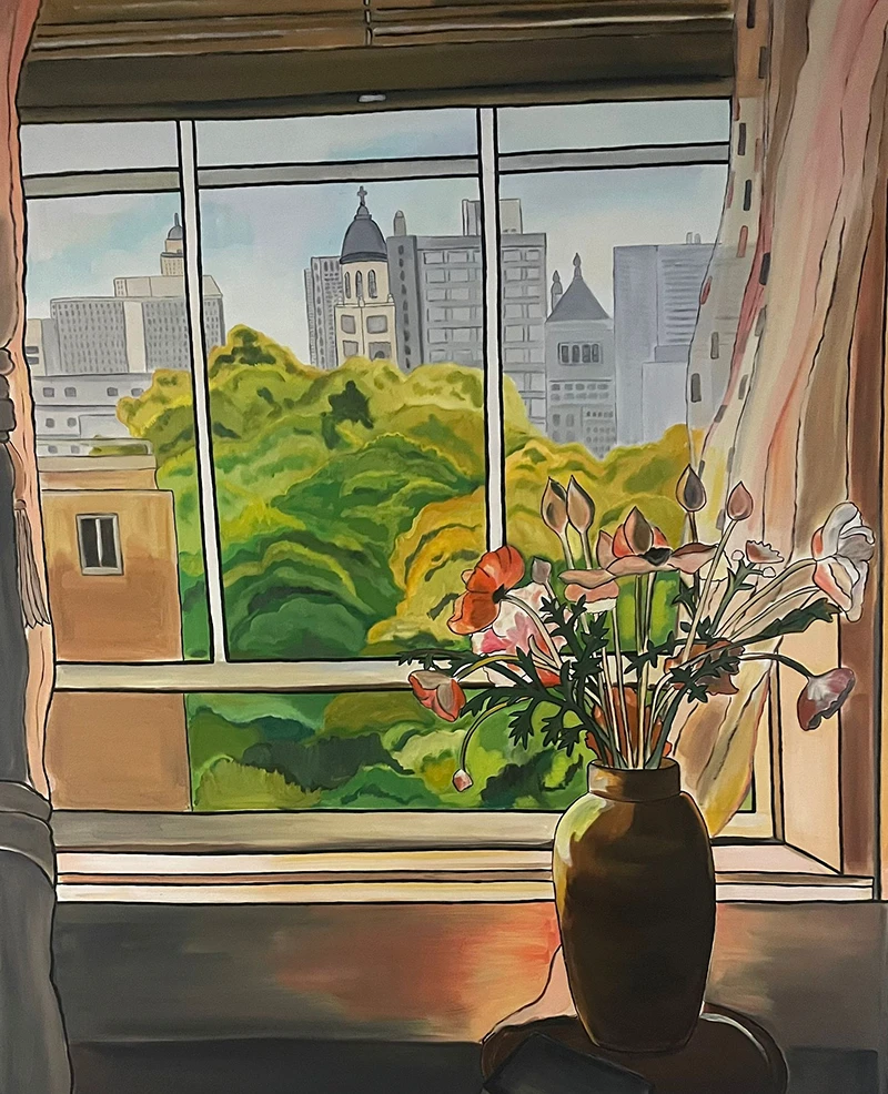 Ach, ich find Fenster toll. Man guckt ja gern aus einem Fenster oder in ein Fenster, um zu sehen, was da auf der anderen Seite ist. Man hat ja nicht nur einen Raum, sondern immer auch etwas, was dahinter ist. Wenn ich jetzt ein Bild male – z. Bsp. da gibt’s ein Bild von meiner Tochter Roxana in New York, wie sie vor einem Fenster sitzt und fernsieht. Aber außerhalb des Zimmers passiert so viel. Ich hörte Geräusche von der Stadt, sah die Lichter, andere Häuser, Fenster… Ich will dem Betrachter die Möglichkeit geben, sich selber eine Geschichte zu bauen.